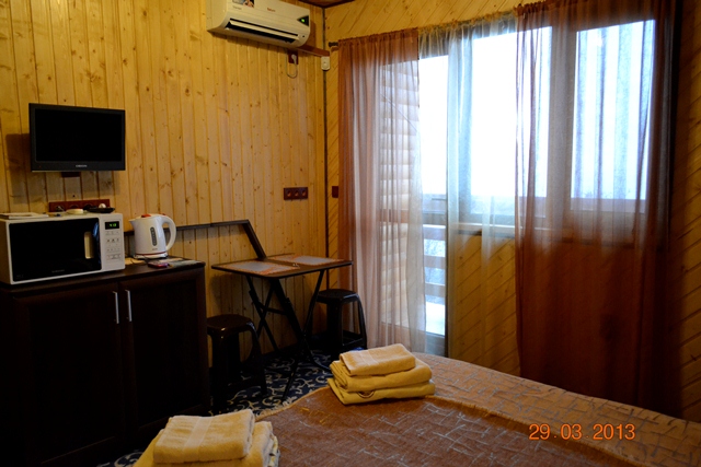 Новый современный экологически чистый деревянный коттедж построен в 2012г. Номера со всеми удобствами – туалет, умывальник, душ, телевизор, холодильник, кондиционер, микроволновка, электрочайник, фен, минимальный набор посуды, Wi-Fi на всей территории. В номера на 2 и 3 этаже балконы с видом на море, на 1 этаже – небольшая терраса.